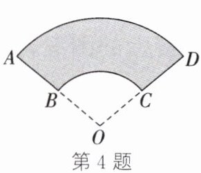 4. (新考向·地域文化)(2024·甘肃)甘肃临夏砖雕是一种历史悠久的古建筑装饰艺术, 是第一批国家级非物质文化遗产. 如图是一块扇形面的临夏砖雕作品的部分设计图, 其中扇形 $OBC$ 和扇形 $OAD$ 有相同的圆心 $O$, 且圆心角 $\angle O = 100^{\circ}$. 若 $OA = 120\mathrm{cm}$, $OB = 60\mathrm{cm}$, 则涂色部分的面积是