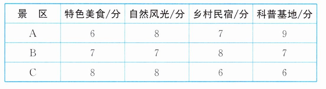 (3) 答案不唯一,如将特色美食、自然风光、乡村民宿及科普基地四个方面得分的百分比定为 $20\%$、$30\%$、$30\%$、$20\%$,则 A 景区的得分为 $6 × 20\% + 8 × 30\% + 7 × 30\% + 9 × 20\% = 7.5$ (分),B 景区的得分为 $7 × 20\% + 7 × 30\% + 8 × 30\% + 7 × 20\% = 7.3$ (分),C 景区的得分为 $8 × 20\% + 8 × 30\% + 6 × 30\% + 6 × 20\% = 7$ (分). $\because 7.5 > 7.3 > 7$,$\therefore$ 选择 A 景区去游玩