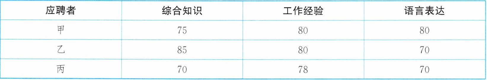 如果将每名应聘者的综合知识、工作经验、语言表达的成绩按5:2:3计算其总成绩,并录用总成绩最高的应聘者,那么被录用的是