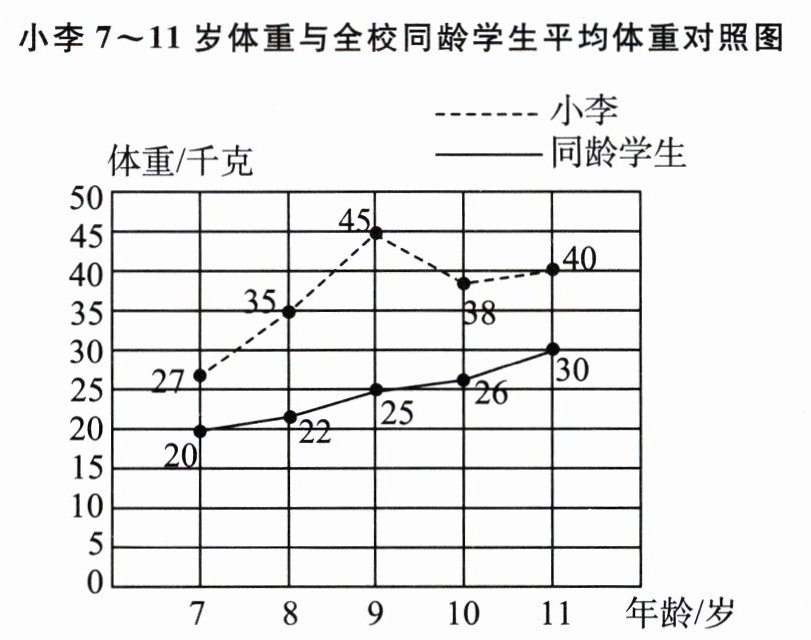 4. 下面是小李7~11岁每年体检时的体重与全校同龄学生平均体重的对照图。