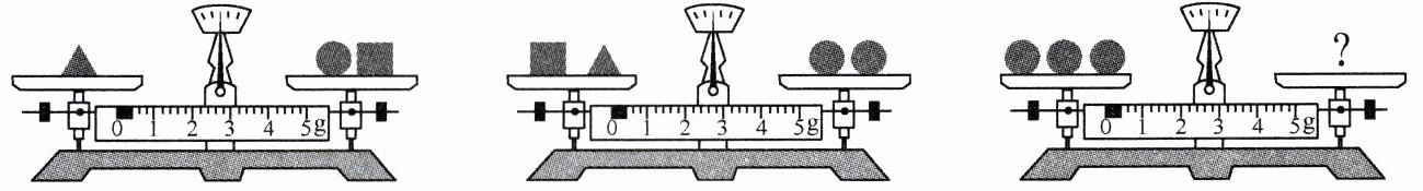 8. 下图中的▲、■、●分别表示三种不同的物体,前两架天平保持平衡。要使第三架天平也保持平衡,那么“?”处应放(