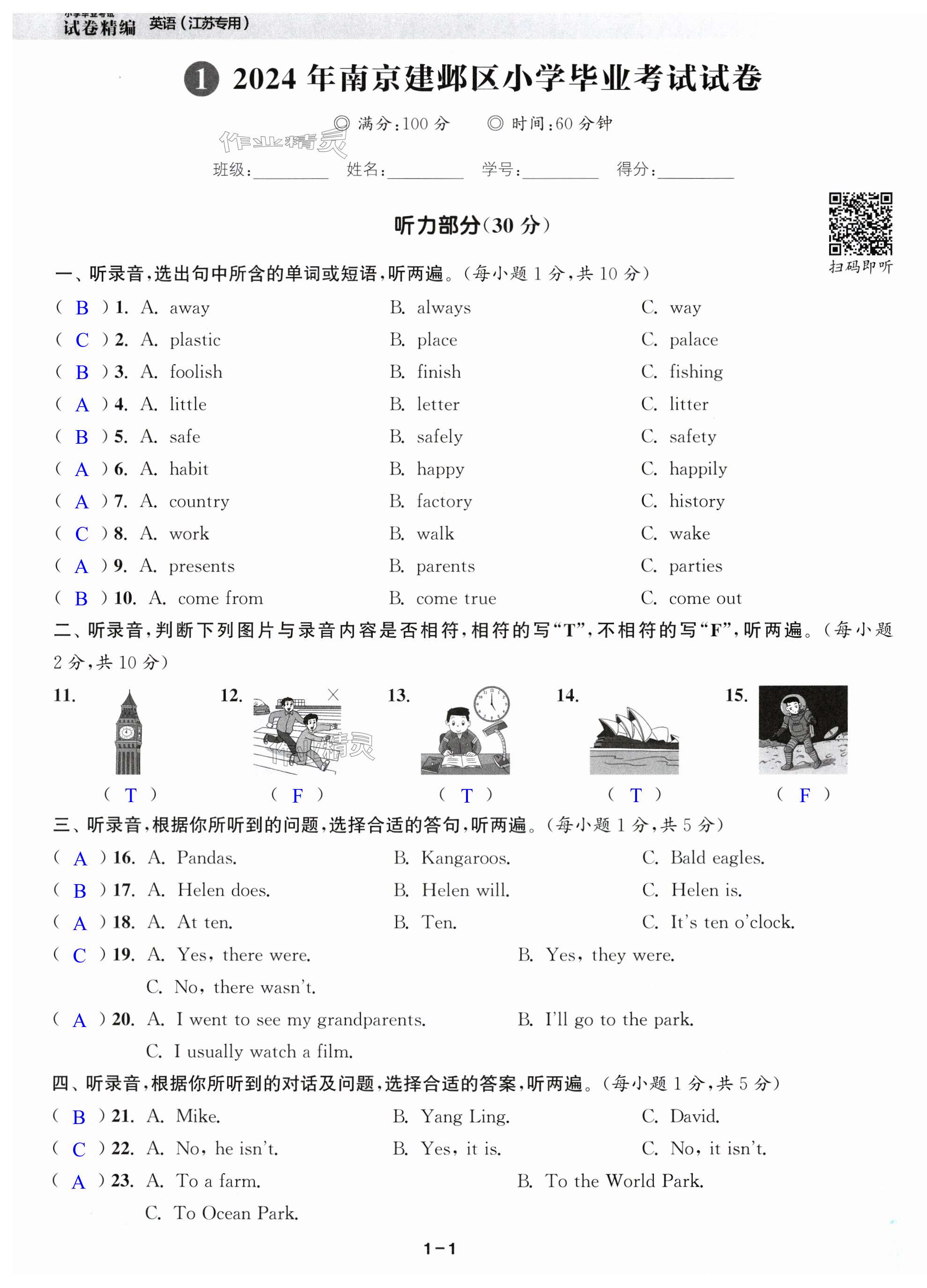 精英家教网> 2025年小学毕业考试试卷精编英语江苏专版 > 第1页 参考答案