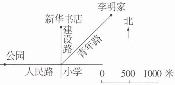 (3) (以小学为观测点,用量角器画出北偏西60°方向,根据比例尺(图上1厘米代表500米)截取1厘米长度确定王文家位置)