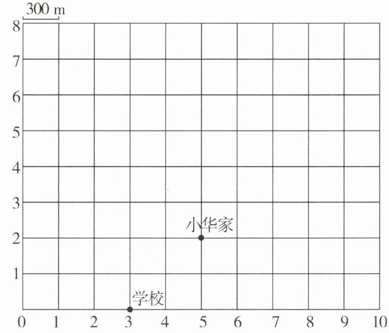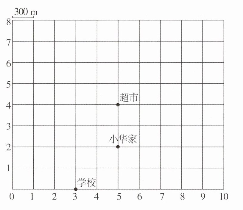 (3) 小华家到超市的纵向距离为$4-2=2$个单位,每个单位代表$300$米,所以距离为$2×300 = 600$米,