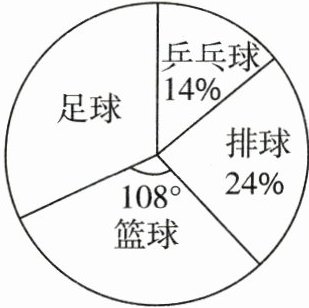 最喜欢乒乓球的占$14\%$,最喜欢排球的占$24\%$,最喜欢篮球的圆心角是$108^{\circ}$,因为整个圆是$360^{\circ}$,所以最喜欢篮球的占比为$\frac{108^{\circ}}{360^{\circ}} = 30\%$。