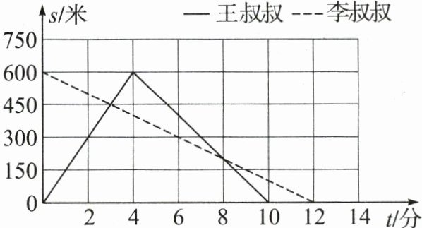 4. 甲、乙两地相距600米,王叔叔骑自行车从甲地去乙地,到达后立即返回;与此同时,李叔叔从乙地出发步行去甲地。他们两人距甲地的距离s(米)和时间t(分)之间的关系如图所示。