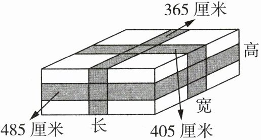 6. 工人用薄木板钉成一个长方体包装箱,并用尼龙编织条(如图)在三个方向上加固,所用尼龙编织条的长度分别为365厘米、405厘米、485厘米。若每个尼龙编织条接头处的重叠部分都是5厘米,则这个长方体包装箱的体积是多少立方米?