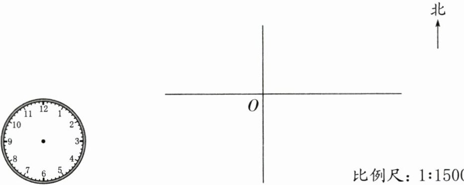 (2)有一只小狗在点O处,且面朝正北方,它要去“5点钟方向”30米处的点A取小球,请你在右上图中标出点A。(1分)