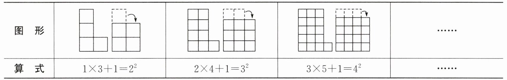 |算式|$1×3+1= 2^{2}$|$2×4+1= 3^{2}$|$3×5+1= 4^{2}$|……|