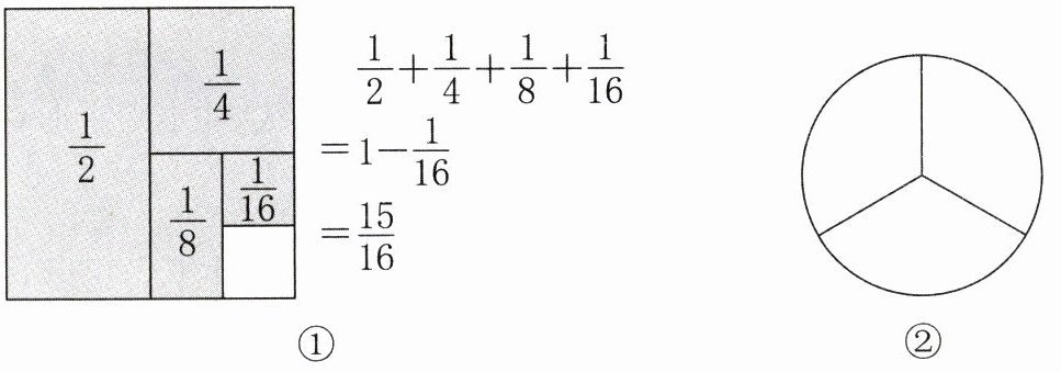 (画图示意:将图②中的圆形先平均分成3份,取其中1份表示$\frac{1}{3}$;再将剩余2份中的1份平均分成2份,取其中1份表示$\frac{1}{6}$;接着将上一步剩余的部分平均分成2份,取其中1份表示$\frac{1}{12}$;最后将最新剩余的部分平均分成2份,取其中1份表示$\frac{1}{24}$,此时圆形中最后剩余一小块未涂色部分为$\frac{1}{24}$)