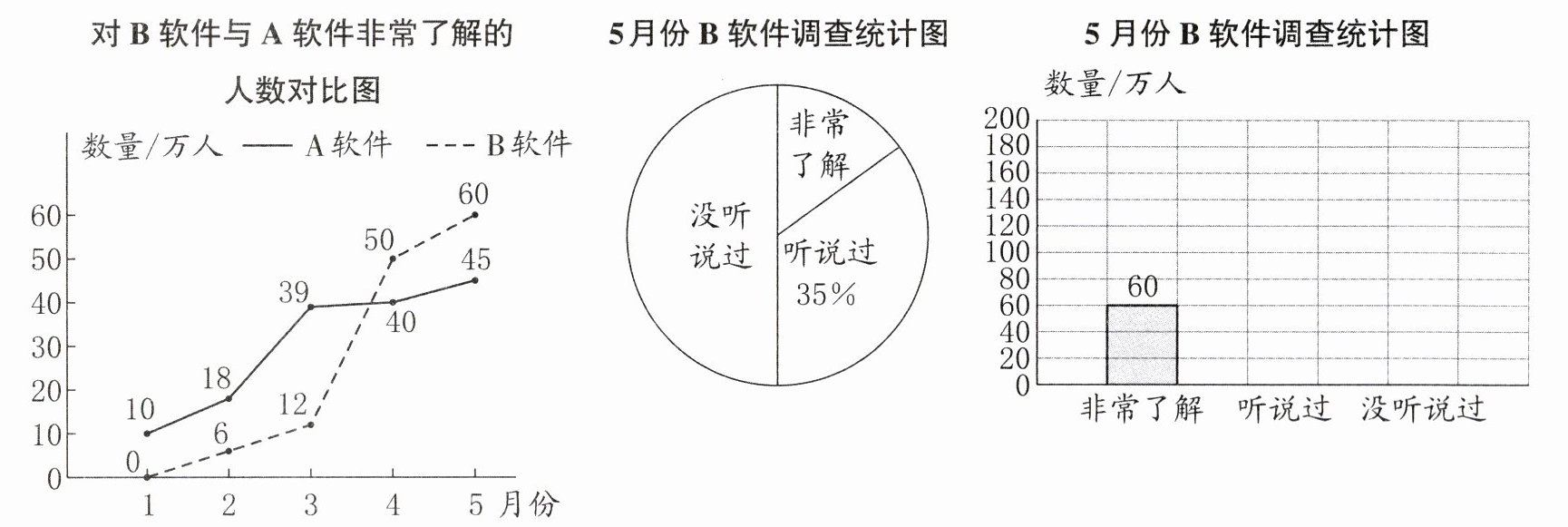 )统计图可以清楚地表示出各部分数量与总数量之间的关系。(1分)(3) 5月份,在B软件调查中,“非常了解”与“听说过”的人数比是(