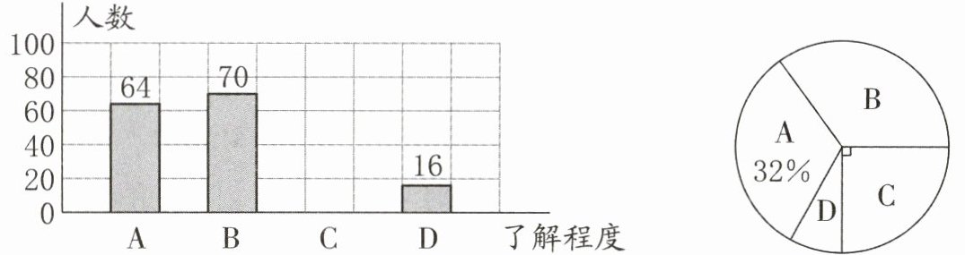 (3)“很了解”(A)的人数是$64$人,“了解较少”(C)的人数是$50$人。
