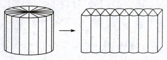 将圆柱拼成等底等高的长方体,长方体的宽就是圆柱的半径,长方体的高就是圆柱的高,长方体的长为圆柱周长的一半,