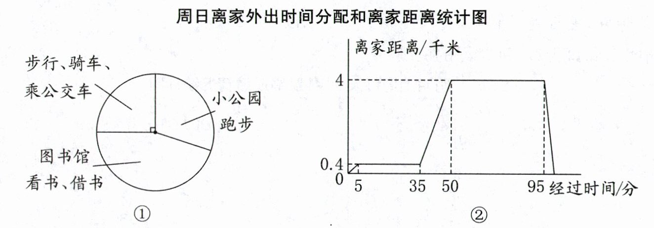 28. 六年级的晨晨养成了每周定时跑步和阅读的习惯。每个周日的早晨,晨晨先是步行到小公园跑步,再骑共享单车去图书馆看书、借书,然后乘公交车回家。下面图①和图②记录了这一过程中的他的时间分配和离家距离情况。