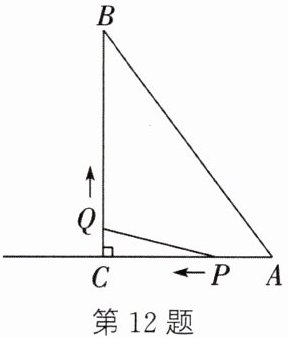 12. (新视角·探究题)如图,在$\triangle ABC$中,$∠ACB= 90^{\circ },AB= 10,BC= 8$,点 P 从点 A 出发沿射线 AC 方向以每秒 2 个单位长度的速度运动,同时,点 Q 从点 C 出发沿边 CB 向点 B 以每秒 1 个单位长度的速度运动.设点 P,Q 运动的时间为 t s,当点 Q 运动到点 B 时,两点停止运动.在运动的过程中,是否存在某一时刻,使得$\triangle PQC的面积是\triangle ABC的面积的\frac {1}{6}$? 若存在,请求出 t 的值;若不存在,请说明理由.