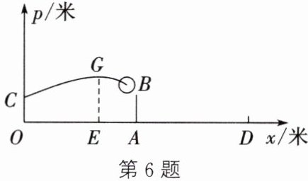 6. 如图,排球场的长OD为18米,位于排球场中线处的球网AB的高为2.24米,某队员站在点O处发球,排球从点O的正上方2米的点C处向正前方飞去,排球的飞行路线是抛物线的一部分,当排球飞行至离点O的水平距离OE为6米时,到达最高点G处,以O为原点建立平面直角坐标系.