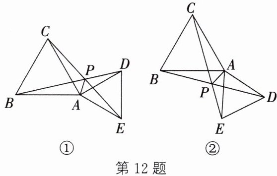 12. (新视角·探究题)$\triangle ABC和\triangle ADE$都是等边三角形.当$\triangle ADE$绕点A旋转到如图①所示的位置时,连接BD,CE相交于点P,连接PA.