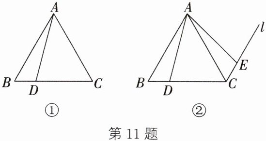 11. (新视角·探究题)如图①, 点 $ D $ 在等边三角形 $ ABC $ 的边 $ BC $ 上, 将 $ \triangle ABD $ 绕点 $ A $ 旋转, 使得旋转后点 $ B $ 的对应点为 $ C $.