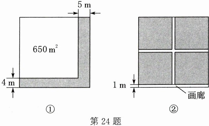 24. (10分)如图①,某校进行校园改造,准备将一块正方形空地划出一部分用于栽种鲜花,原空地一边减少了4m,另一边减少了5m,剩余部分的面积为$650m^{2}$.