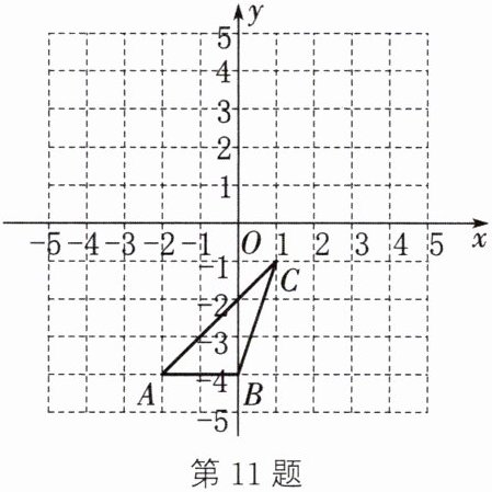 11. 如图,在平面直角坐标系中,$ \triangle ABC $ 的顶点均在格点上,点 $ A $ 的坐标为 $ (-2,-4) $,点 $ B $ 的坐标为 $ (0,-4) $,点 $ C $ 的坐标为 $ (1,-1) $.