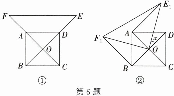 6. 如图①,点 O 为正方形 ABCD 的中心,分别延长 OA,OD 至点 F,E,使$OF= 2OA,OE= 2OD$,连接 EF.将$\triangle EOF$绕点 O 逆时针旋转得到$\triangle E_{1}OF_{1}$,旋转角为α(如图②),连接$AE_{1},BF_{1}.$