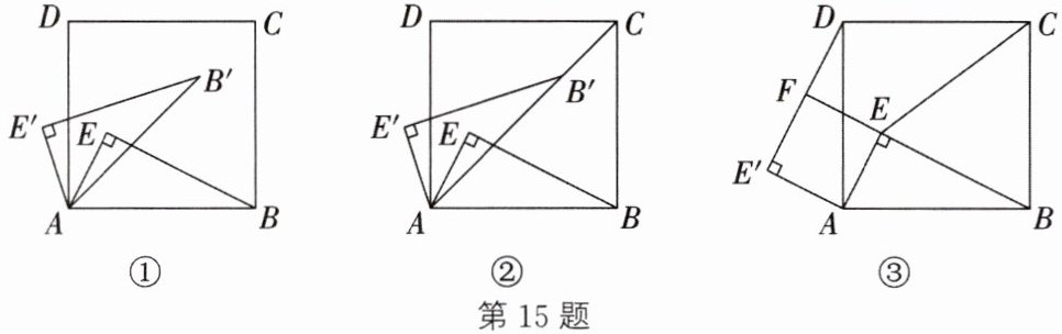 15. (2023·启东期末)如图①,E 为正方形 ABCD 内一点,$AE= 2,BE= 4,∠AEB= 90^{\circ }$,将$Rt\triangle ABE$绕点 A 逆时针旋转$α(0^{\circ }≤α≤180^{\circ })得到Rt\triangle AB'E'$(点 B,E 的对应点分别为$B',E'$).