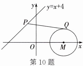10. (2024·凉山)如图,$\odot M的圆心为M(4,0)$,半径为2,$P是直线y= x+4$上的一个动点,过点$P作\odot M$的切线,切点为$Q$,则$PQ$长的最小值为______