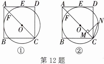 12. (2024·绥化)如图①,$O是正方形ABCD的对角线AC$上一点,以点$O$为圆心,$OC为半径的\odot O与AD相切于点E$,与$AC相交于点F$.