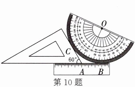 10. 将一把直尺(单位:cm)、一块含60°角的三角尺和一个量角器按如图所示的方式摆放,60°角的顶点A对应直尺上的刻度4,B为量角器与直尺的切点,对应直尺上的刻度7,则该量角器的直径是______cm.