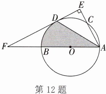 12. (新考向·传统文化)(2024·海安二模)在古代,智慧的劳动人民已经会使用“石磨”,其原理为在磨盘的边缘连接一个固定长度的“杠杆”,推动“杠杆”带动磨盘转动,将粮食磨碎.如图,AB为$\odot O$的直径,AC是$\odot O$的一条弦,D为$\overset{\frown }{BC}$的中点,作直线$DE⊥AC$交AC的延长线于点E,交AB的延长线于点F,连接DA.