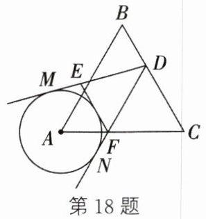 18. (2023·启东期中)如图,$△ABC$是边长为3的等边三角形,$\odot A$的半径为1,D是边BC上一动点,DM,DN分别切$\odot A$于点M,N,$\odot A$的另一条切线分别交DM,DN于点E,F,则$△DEF$的周长l的取值范围是 (