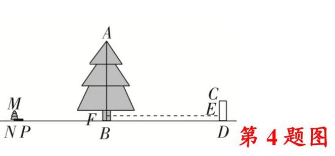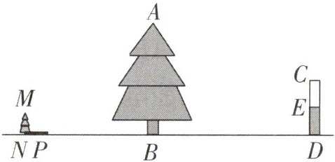 4. 某小组的项目式学习活动内容是测量某棵古树的高度AB. 如图,在阳光下,某一时刻,古树AB的影子落在了地上和围墙上,落在地上的长度$BD=21$米,落在墙DC上的长度$DE=1$米,在古树的附近有一棵小树MN,同一时刻,小树的影长$PN=1.8$米,小树的高$MN=1.2$米. 已知点N,P,B,D在一条水平线上,$MN⊥ND,AB⊥ND,ED⊥ND$,请求出该古树的高度AB.