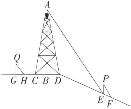 5. 如图,在斜坡顶部有一铁塔AB,B是CD的中点,CD是水平的. 在阳光的照射下,塔影DE留在斜坡面上. 在同一时刻,小明站在点E处,其影子EF在直线DE上,小华站在点G处,影子GH在直线CD上,他们的影子长分别为2m和1m. 已知$CD=12m,DE=18m$,小明和小华的身高均为1.6m,那么塔高AB为多少米?