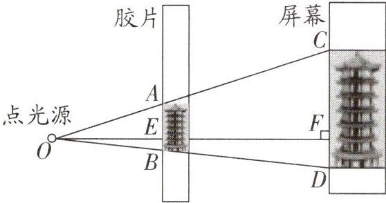 2. (2024秋·宝安区校级期中)如图,点光源O射出的光线沿直线传播,将胶片上的建筑物图片AB投影到与胶片平行的屏幕上,形成影像CD. 已知$AB=0.3dm$,点光源到胶片的距离OE长为6dm,$CD$长为4.3dm,则胶片与屏幕的距离EF为(