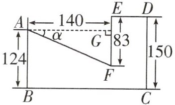 解: $ EG = CD - AB = 150 - 124 = 26 $ (mm),则 $ GF = EF - EG = 83 - 26 = 57 $ (mm)。在 $ Rt\triangle AGF $ 中,$ \tan \alpha = \frac{GF}{AG} = \frac{57}{140} $,由计算器可得 $ \alpha = 22^{\circ}9'12'' $。