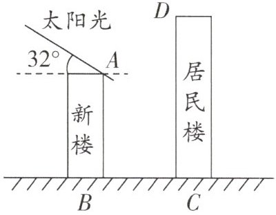 6. 某居民小区有一朝向为正南方向的居民楼(如图),该居民楼的一楼是高6米的小区超市,超市以上是居民住房.在该楼的前面15米处要盖一栋高20米的新楼.当冬季正午的阳光与水平线的夹角为32°时(结果保留整数,参考数据:$\sin 32^{\circ} \approx \frac{53}{100}$,$\cos 32^{\circ} \approx \frac{106}{125}$,$\tan 32^{\circ} \approx \frac{5}{8}$).