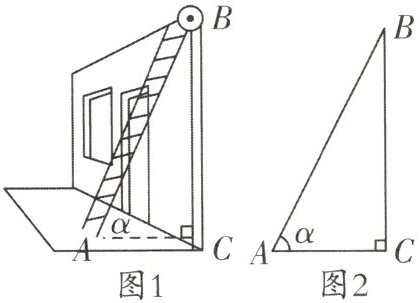 1. 如图1,梯子斜靠在竖直的墙上,其示意图如图2.梯子与地面所成的角α为75°,梯子AB长3m,求梯子顶部离地的竖直高度BC.(结果精确到0.1m;参考数据:sin75°≈0.97,cos75°≈0.26,tan75°≈3.73)