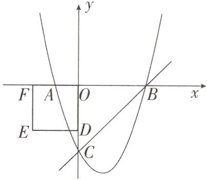 (3)如图,D为y轴的负半轴上一点,且$OD = 2$,以OD为边作正方形ODEF,将正方形ODEF以每秒1个单位的速度沿x轴的正方向移动,在运动过程中,设正方形ODEF与$\triangle OBC$重叠部分的面积为S,运动的时间为t秒$(0<t\leqslant2)$.