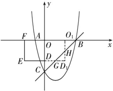 (3)①当正方形 $ODEF$ 的顶点 $D$ 运动到直线 $BC$ 上时,设点 $D(m,-2)$,根据题意,得 $-2 = m - 3$,$\therefore m = 1$。当 $0 < t \leq 1$ 时,正方形 $ODEF$ 和 $\triangle OBC$ 的重合部分是矩形;$\because OO _ { 1 } = t$,$OD = 2$,$\therefore S = 2t$。当 $1 < t \leq 2$ 时,正方形和 $\triangle OBC$ 的重合部分是五边形,如图所示,$\because OB = OC = 3$,$\therefore \triangle OBC$,$\triangle D _ { 1 } GH$ 都是等腰直角三角形,