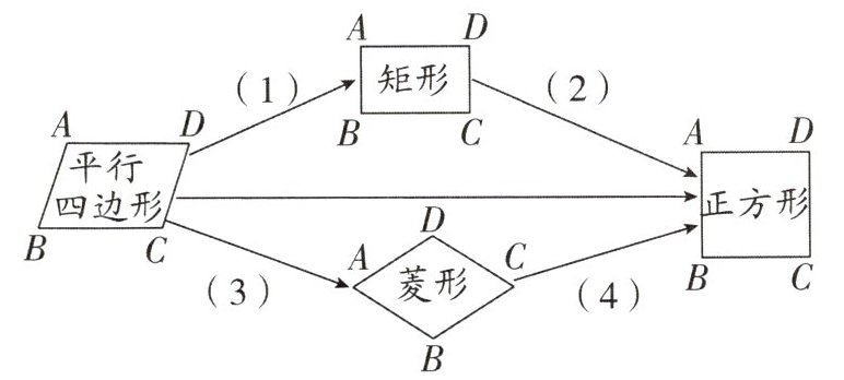 2. (2024秋·光明区月考)小琦在复习几种特殊四边形的关系时整理如图,(1)(2)(3)(4)处需要添加条件,则下列条件添加错误的是(