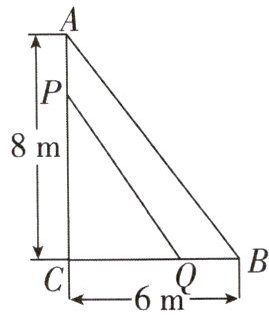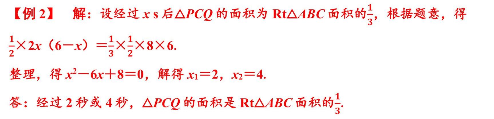 【例2】(根据九年级北师大版教材P53第2题改编)如图,在Rt△ABC中,∠C=90°,AC=8m,BC=6m,点P,Q同时由C,B两点出发分别沿CA,BC方向向点A,C匀速移动(一个点到达终点时另一个点也停止运动),点P,Q的速度分别是2m/s和1m/s,经过几秒△PCQ的面积是Rt△ABC面积的$\frac{1}{3}$?
