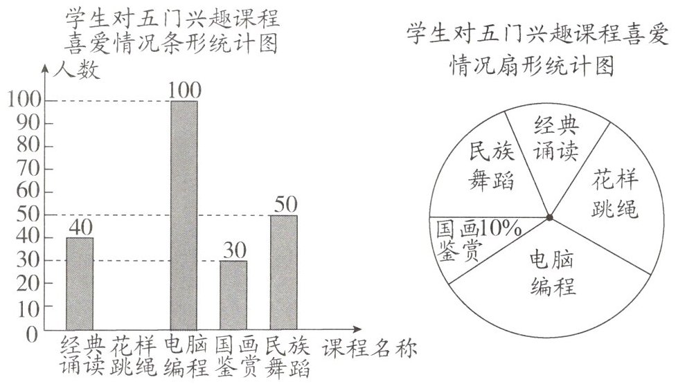 7. (2024·南山区校级三模)某学校为丰富课后服务内容,计划开设经典诵读、花样跳绳、电脑编程、国画鉴赏、民族舞蹈五门兴趣课程.为了解学生对这五门兴趣课程的喜爱情况,随机抽取了部分学生进行问卷调查(要求每位学生只能选择一门课程),并将调查结果绘制成如图两幅不完整的统计图.