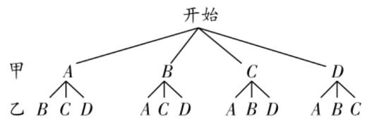 一共有12种等可能的结果,其中乙选中球拍C有3种可能的结果,