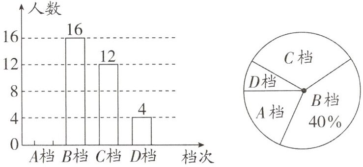 (1)本次调查的学生共有____人;扇形统计图中,C档对应的圆心角度数为____;请将条形统计图补充完整;