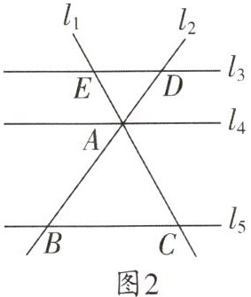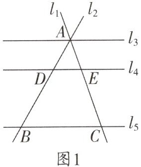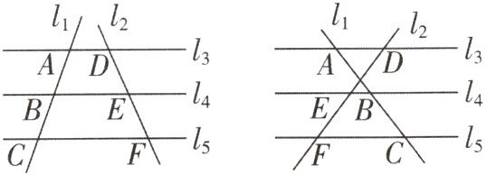 常考模型:如图,$ l _ { 3 } // l _ { 4 } // l _ { 5 } $,可得$ \frac { A B } { B C } = \frac { D E } { E F } $或$ \frac { A B } { A C } = \frac { D E } { D F } $或$ \frac { B C } { A B } = \frac { E F } { D E } $或$ \frac { B C } { A C } = \frac { E F } { D F } $或$ \frac { A B } { D E } = \frac { B C } { E F } $等.