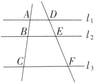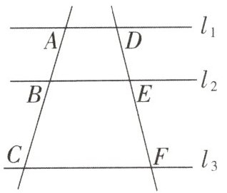如图,已知$ l _ { 1 } // l _ { 2 } // l _ { 3 } $,若$ A B = 1 $,$ B C = 2 $,$ D E = 1.5 $,求$ E F $的长.