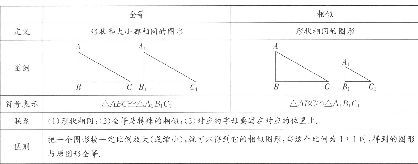 的比叫做相似比.**归纳**:相似与全等的联系与区别