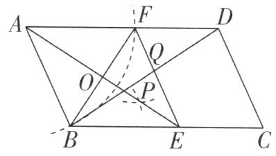 6. (2023·深圳期中)如图,在$□ A B C D$中,以$A$为圆心,$AB$长为半径画弧交$AD$于点$F$,再分别以$B$,$F$为圆心,大于$\frac { 1 } { 2 } B F$长为半径画弧,两弧交于点$P$,连接$AP$并延长交$BC$于点$E$,连接$EF$,连接$AE$,$BF$相交于点$O$.