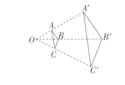对点训练2(2023·长春)如图,$ \triangle ABC $ 和 $ \triangle A'B'C' $ 是以点 $ O $ 为位似中心的位似图形,点 $ A $ 在线段 $ OA' $ 上。若 $ OA : AA' = 1 : 2 $,则 $ \triangle ABC $ 与 $ \triangle A'B'C' $ 的周长之比为
