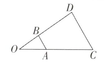 2. 如图,以点 $ O $ 为位似中心,将 $ \triangle OAB $ 放大后得到 $ \triangle OCD $,$ OA = 3 $,$ AC = 5 $,则 $ \frac{AB}{CD} = $